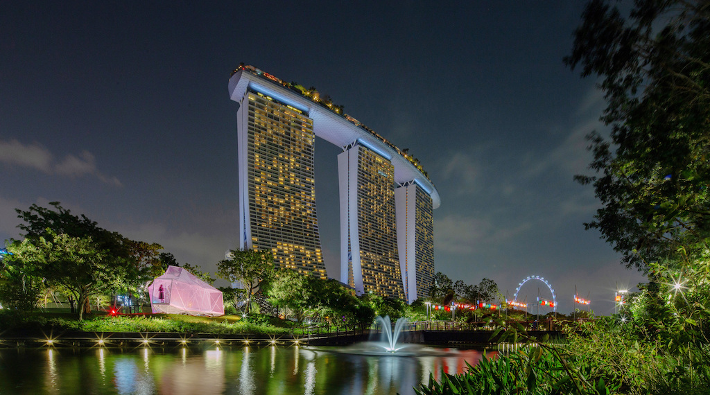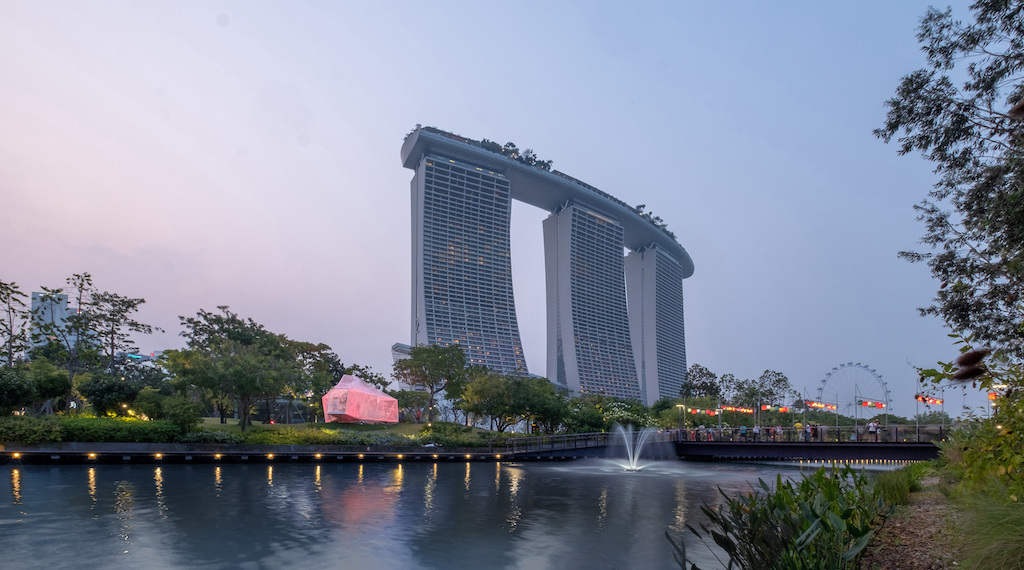 The form of AirMesh is conceived as a polyhedron defined by four rectangular view frames oriented towards highlights in the surrounding landscape: the dragonfly bridge, the silver garden, the Marina Bay Sands, and the pavilion entrance. Its faceted form reinterprets a traditional Chinese lantern, lighting up in dynamic colour gradients.
