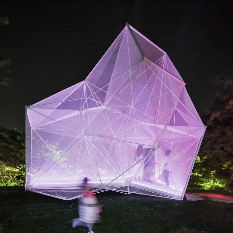 The ultra-lightweight pavilion, located at Gardens by the Bay, is both a gathering space and a light sculpture.