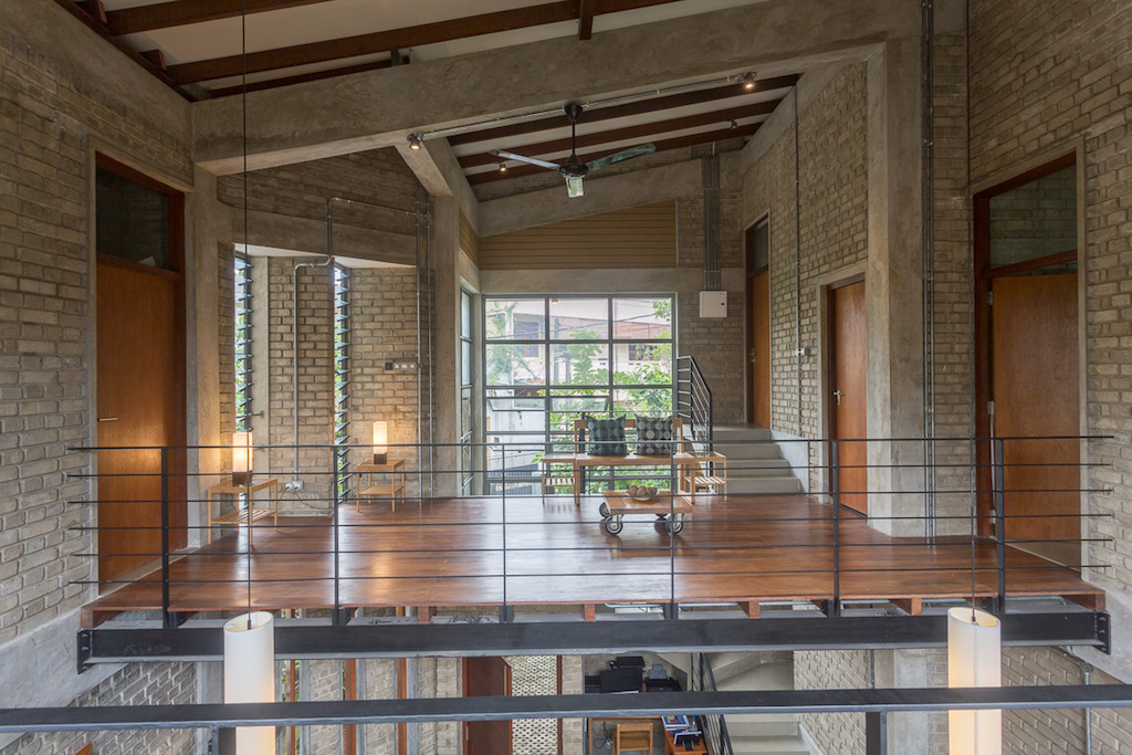 To counter the cookie-cutter setting of the area, Pagoda house wraps its open inner spaces with a shell of un-plastered cement brick set into the frame of a raw concrete structure. The rear of the house contains the living dining room and kitchen on the ground floor, with bedrooms above. The living and dining areas look into the rear garden from the west, with the guest room on the opposite side.