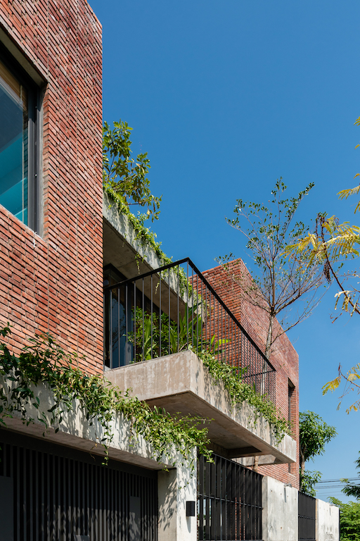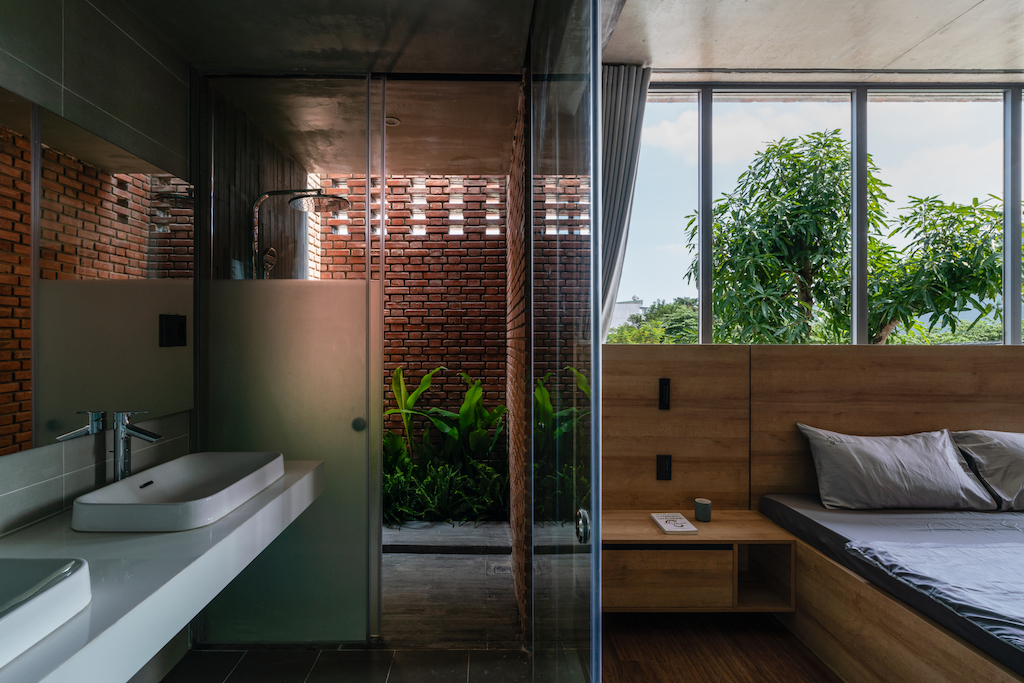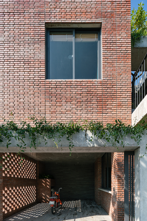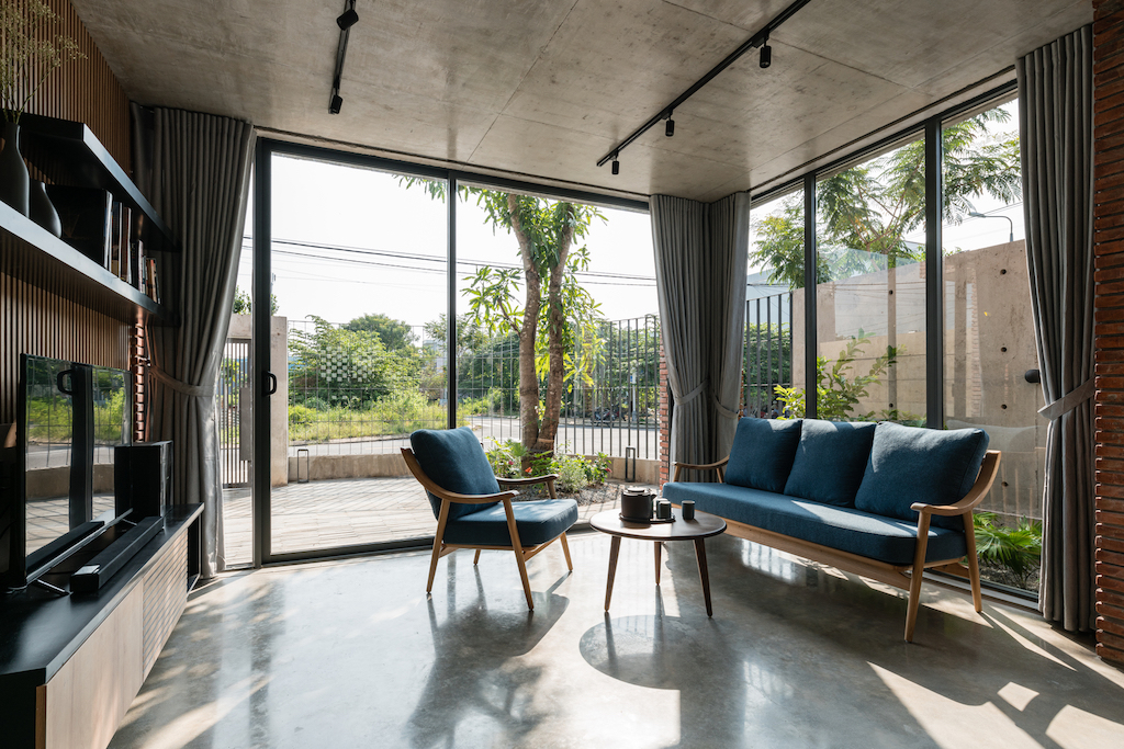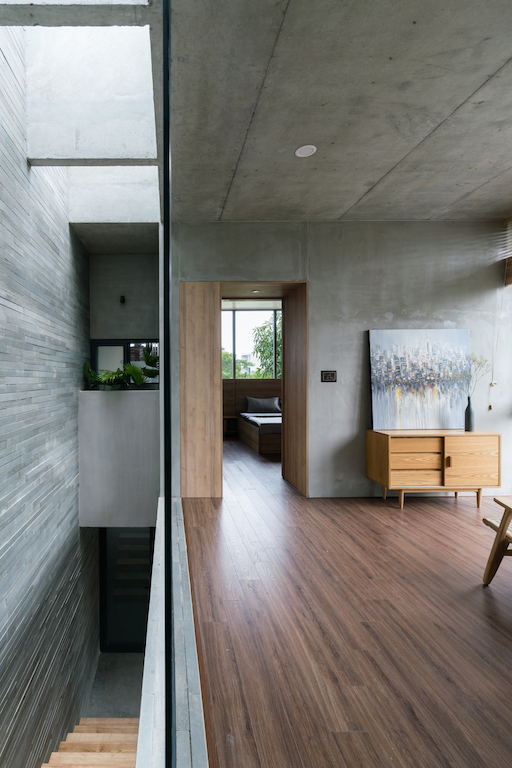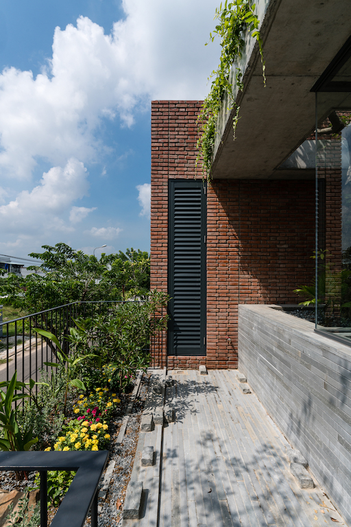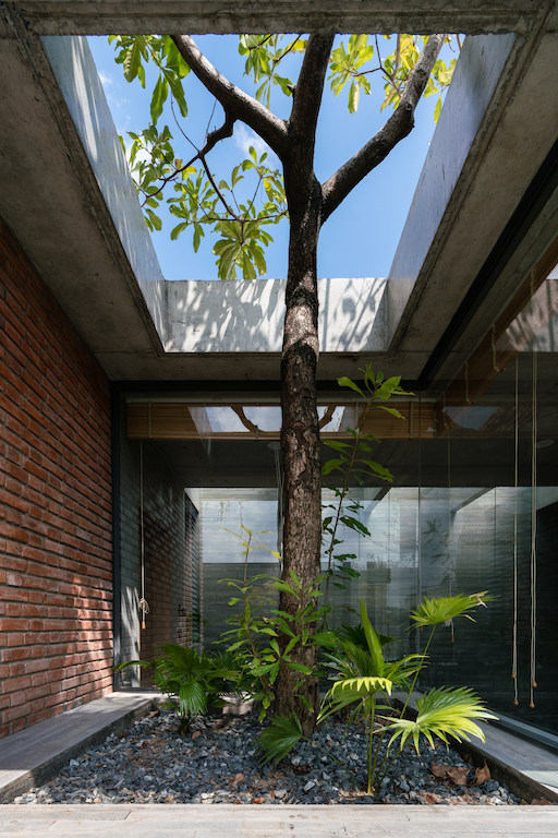 “The materials we use are natural such as rough brick, concrete, steel, wood, stone. These materials’ shades will change over time with the maturity of the family’s kids. Trees are arranged in every corner if possible, inside and outside the house, to reduce the heat radiation, filter the air and create a sense of relaxation.” – Architect Phan Văn Trần Tuấn