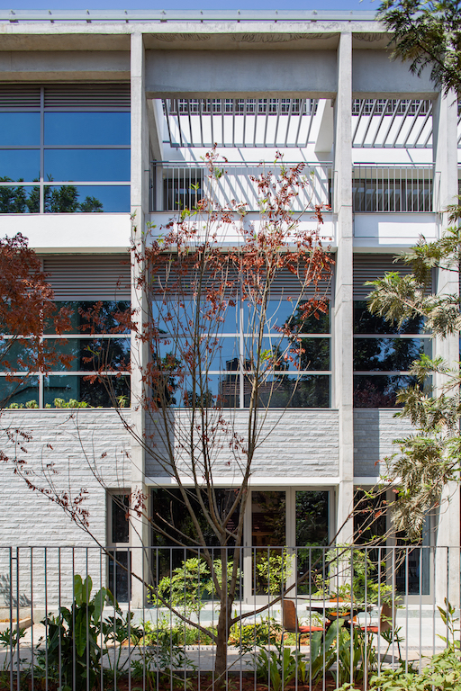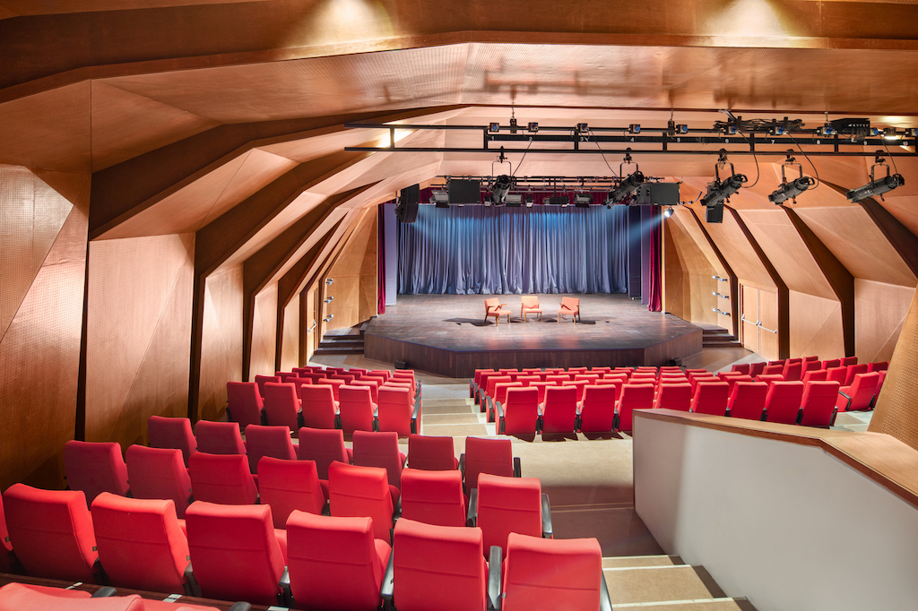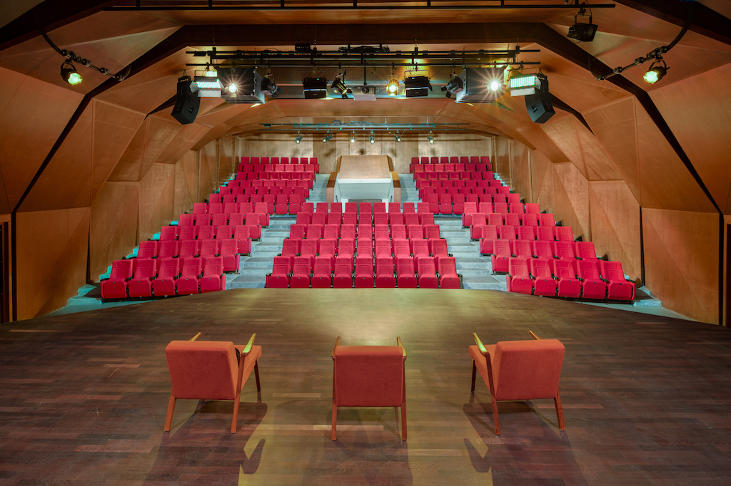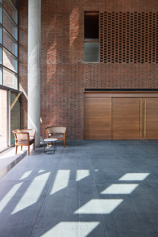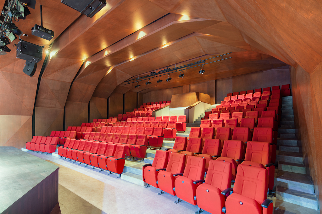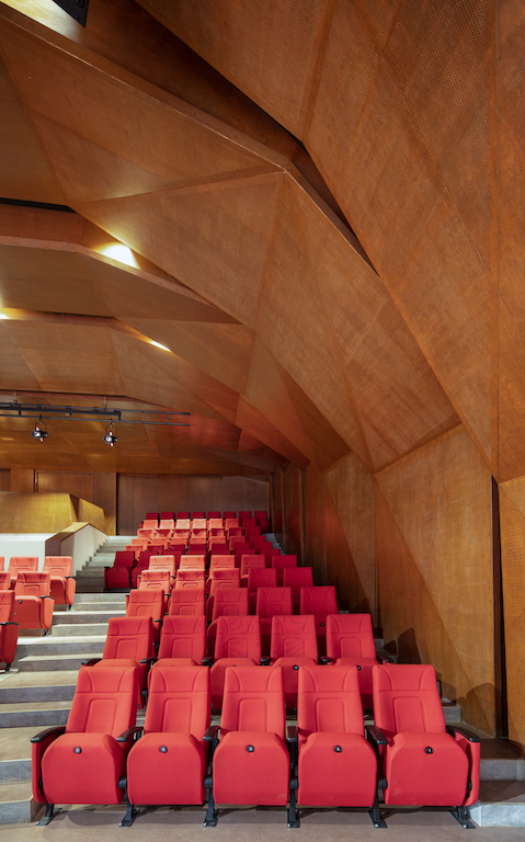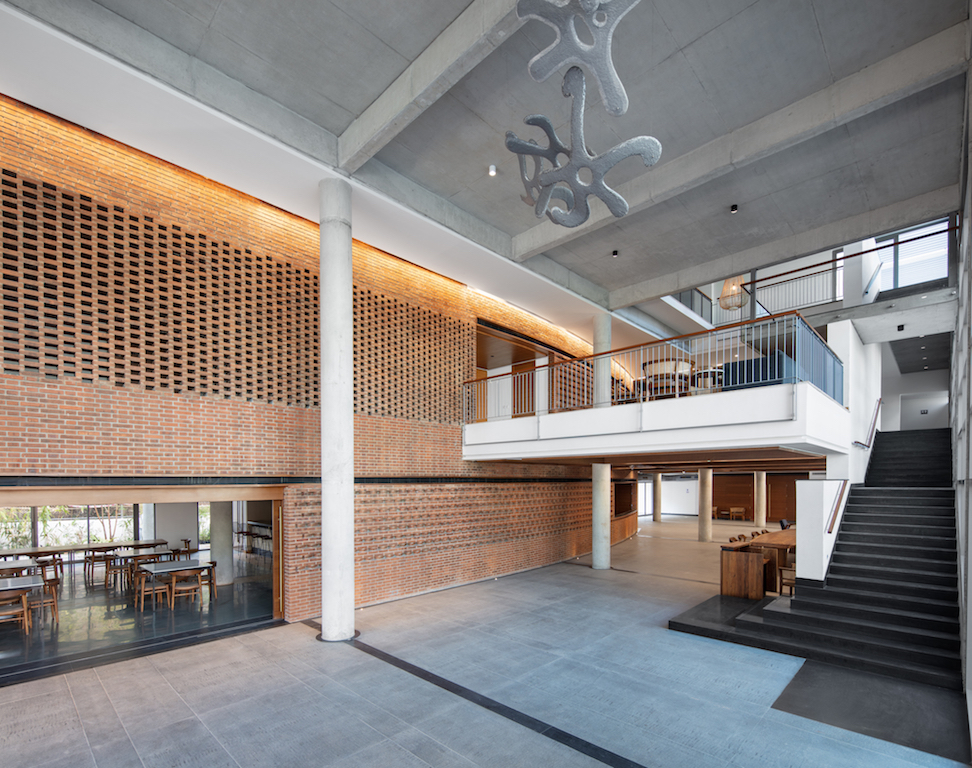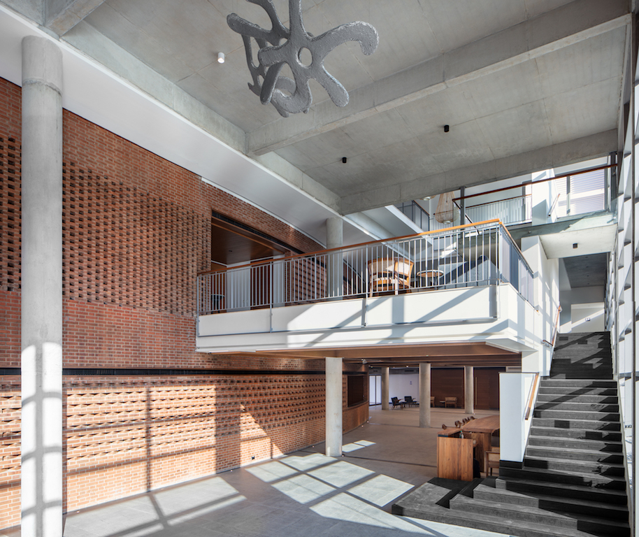 The 4,420m² public facility serves as both a spill-out/pre-function for a 185-seat auditorium, two seminar rooms, an art gallery, a library, and a restaurant and as a flexible place for congregation, smaller performances and art exhibitions, among others. Seen through the glass facade and framed by three-story concrete portals, this public life of the building is revealed and celebrated.