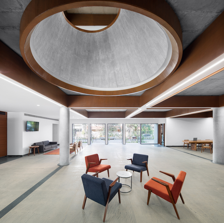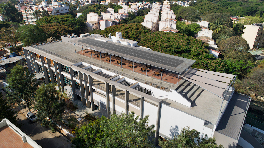 In addition to this, landscaped gardens, designed by Varna Shashidhar of VSLA practice on the ground floor and the terrace offers additional spaces for gathering under a large solar roof. In 2012, the BIC invited proposals through an open competition for its new facility and our proposal was adjudged as the winner from a pool of 90 entries. Central to the scheme was a public space elevated to the second floor and visible from the street. The extension and elevation of this public space announced the agenda of BIC to be a democratic institution, where public participation was its core concern.