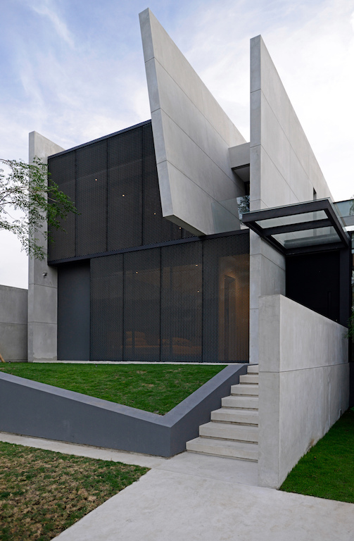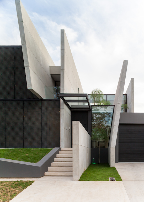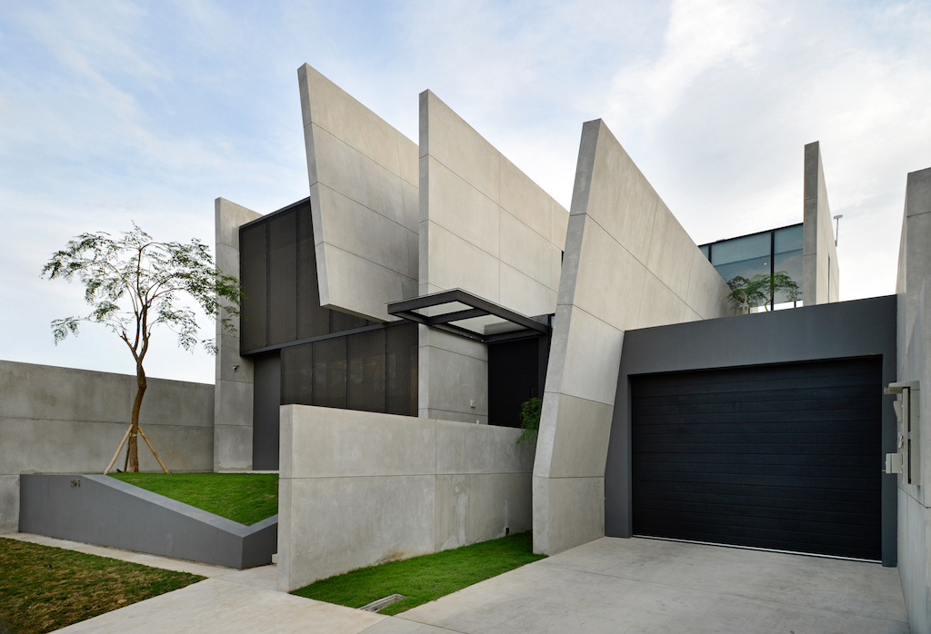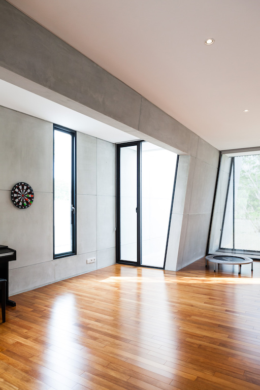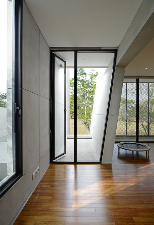The primary walls extend past the interior to the exterior to create privacy for each area. Towards the back of the house, a primary wall that continues from the entrance separates the indoor living space to the outdoor swimming pool area. These series of walls are punctured perpendicularly by openings, walkways or bridges that serve as connections from one area to another. These primary walls of different lengths are rendered with an exposed cement finish, to differentiate with other secondary partition elements.