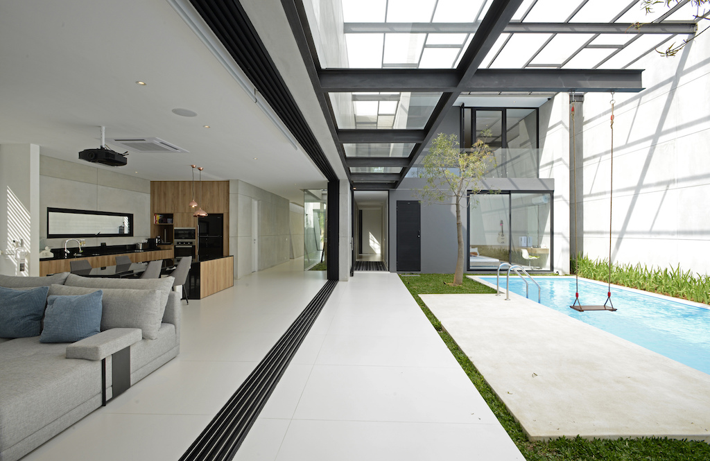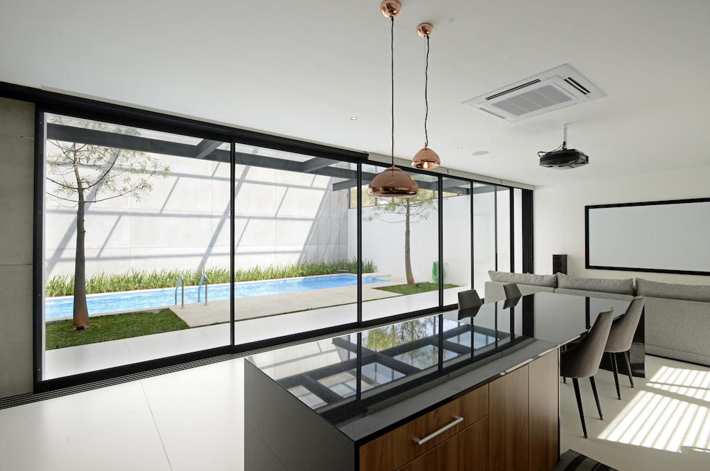 The sliding glass doors on the living area open fully to connect the living and dining areas of the house to the rear outdoor area. The rear outdoor area and swimming pool is exposed to the weather but protected by a stainless steel net to keep out mosquitos.