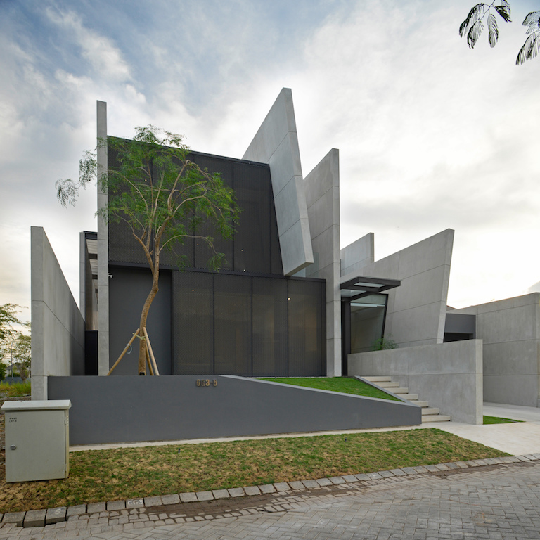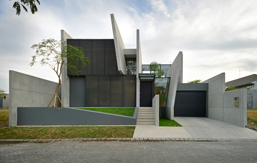 Designed by Ivan Priatman Architecture, JJ House is a modern tropical residence for a family of four in Surabaya, Indonesia. The 468m² house is characterised by a series of parallel primary walls that become the primary organising element of the house. Towards the front of the house, the walls separate the garage and service areas, the house entrance, and the bedrooms. The entrance space defined by two primary walls, continues to a straight corridor leading to the main living-dining area towards the back of the house, becoming the spine of the house with bedrooms flanking one side and service areas flanking the other side.
