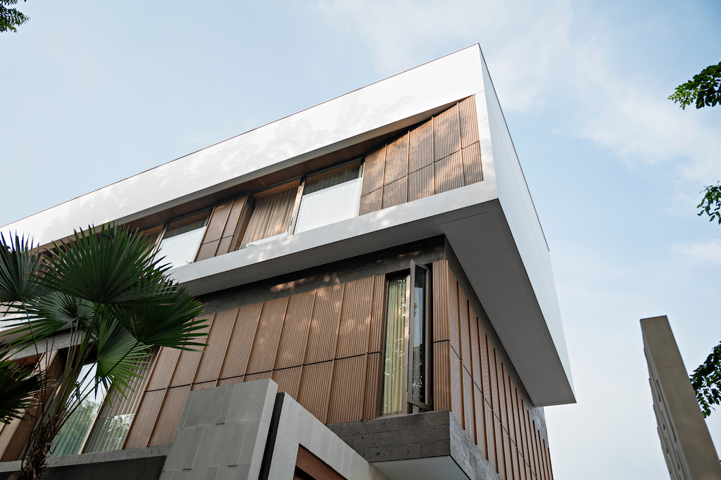 On the other side of the house, the design team placed the dry kitchen area and dining area which also features a kitchen island counter that can be used for breakfast and meal preparation. The second and third levels are the private zones housing five ensuite bedrooms. The wooden slats on the skylight on the upper level tone down the lighting and create an interesting shadow patterns. The tropical house has been built using many local materials such as Sungkai wood.