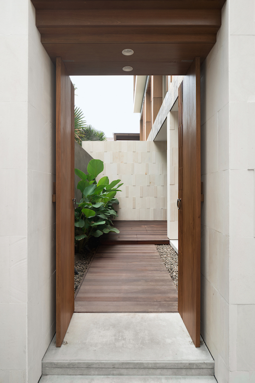 Despite the limitation of the site’s size, the design team, led by architect Widiadnyana, created a spacious house by carving out ample spaces for seating and relaxing, including a linear swimming pool on the ground floor. Full-length foldable glass doors frame the view towards the pool.