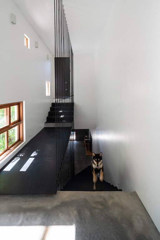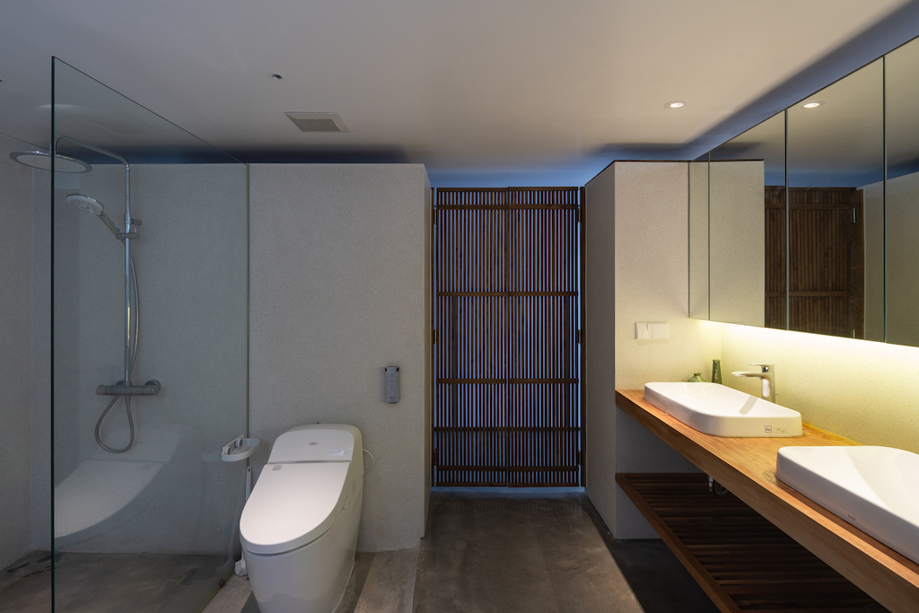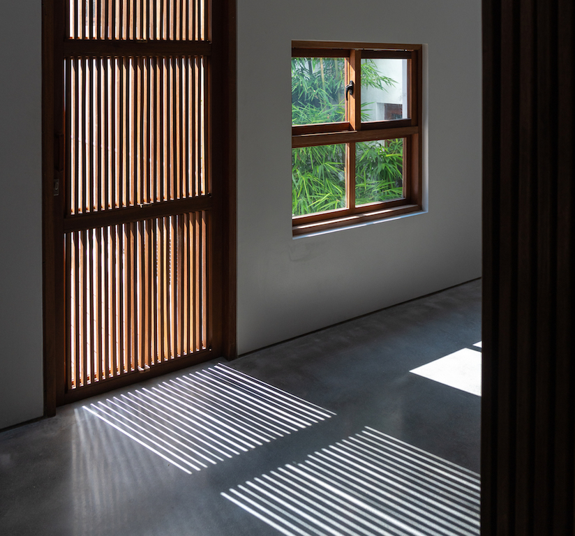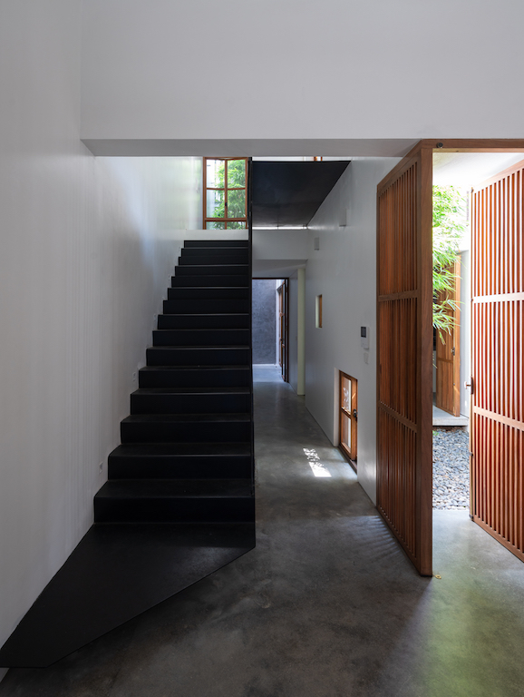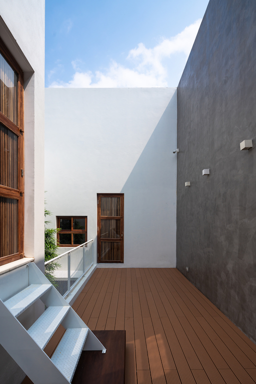 The first yard presents a routine approach (along the long axis of the land) set up to a 90-degree angle, where the main door is located offering privacy, while avoiding direct sunlight of the west. The central space forms the second yard which functions as the divider of light and wind for four space that surround it – guest room, corridor, kitchen and working room. On the other hand, the third yard has been landscaped and provides ventilation for the kitchen area, master restroom and master bedroom along the vertical axis.