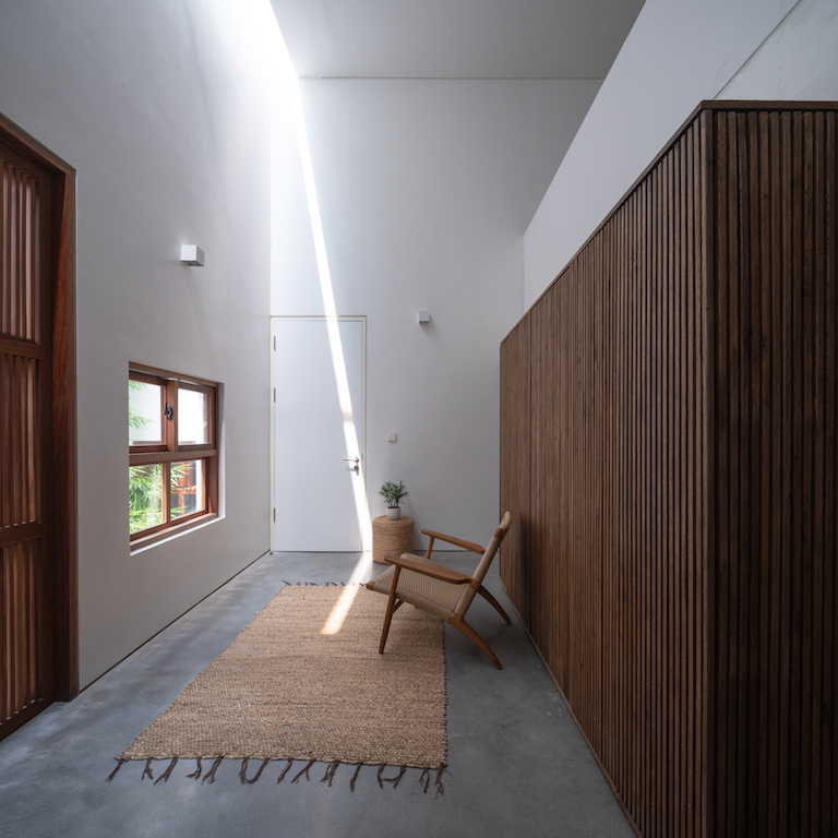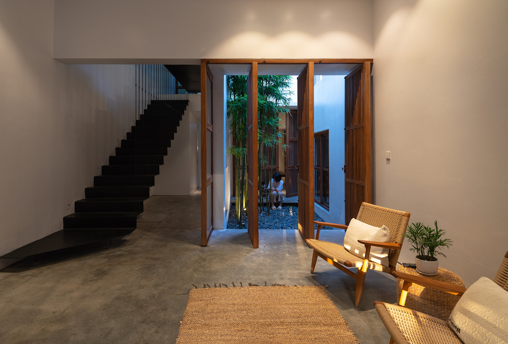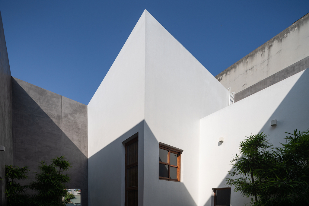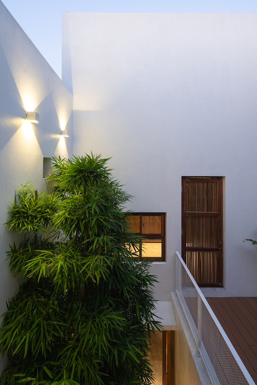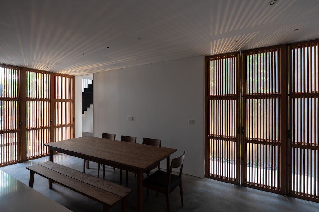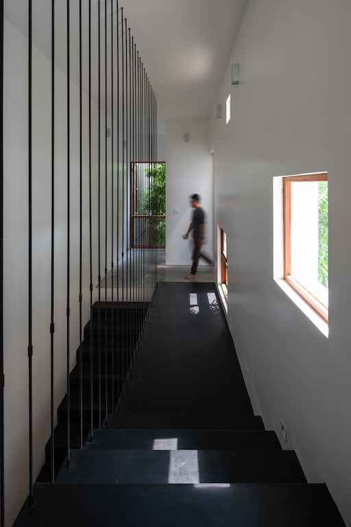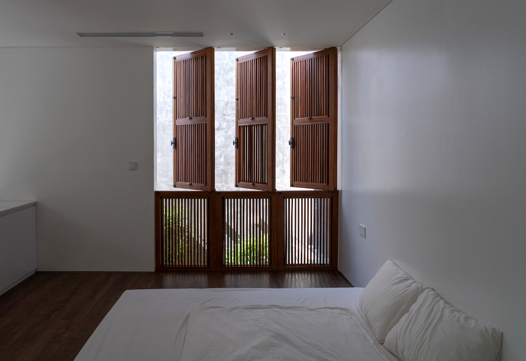 Designed by AHL Architects, and led by architect Nguyen Manh Hung, the basic concept is centered on playing with the geometric linear axis to provide a solution for an introverted living space that is completely open to nature and optimises the space and natural lighting, as per the brief given by the client. The structure comprises four functional blocks calculated in volume in accordance with the function used and the formation of three courtyards from the shifting of those blocks within the permitted built area.