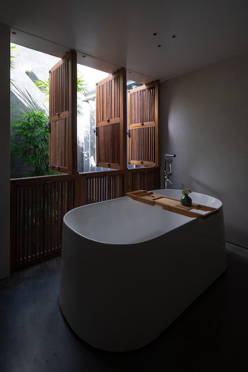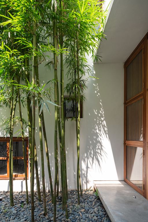 Bamboo is the main material in all three courtyards, contributing green areas and strong, simple lines of the bamboo trunk to the overall architecture. A minimalist 9-metre high wall engulfs the three courtyards with carefully considered windows, controlling the viewing angle and minimising direct sunlight from the west of the whole façade.