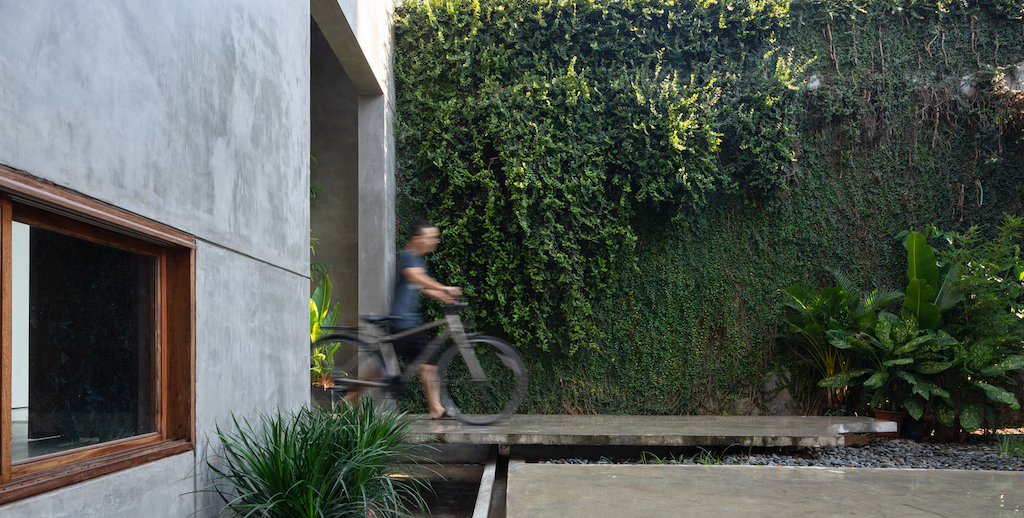 One of the main elements in the outdoor area is the natural climbing system of spiral vines on the perimeter wall concrete corridor leading into the house, running along the concrete corridor leading into the house, and has been present for a number of years. The architects decided to retain it and incorporate it into the new structure.