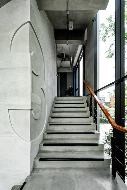 The building presents a composite structure between concrete and steel. The top two floors are steel frame structure and the bottom part is concrete structure with post-tension floor system. Concrete elevator core is showed as an exposed concrete wall with embedded floor numbers with reinforced concrete stairs wrap around. The glass walls along the stairs are pushed out as another skin layering over the concrete core.