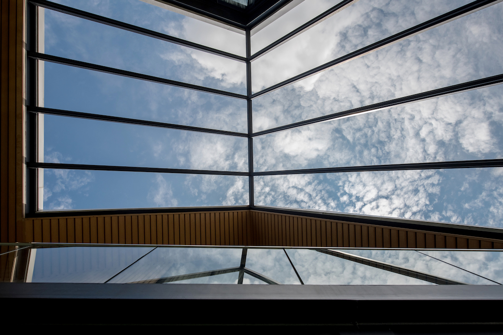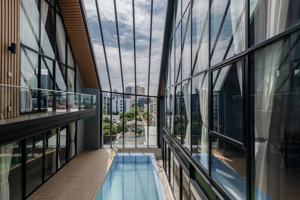 This resulted in a steep gable roof shape for the residential unit on the top with large glass façade in the north for the office spaces. Vertical aluminium fins and architectural elements have been applied on the western façade to provide maximum shading for the west wall. The swimming pool is a critical factor that anchors the residential floors. The floors are split at half level since the pool has to sit on the main floor and the space below is needed for the office.