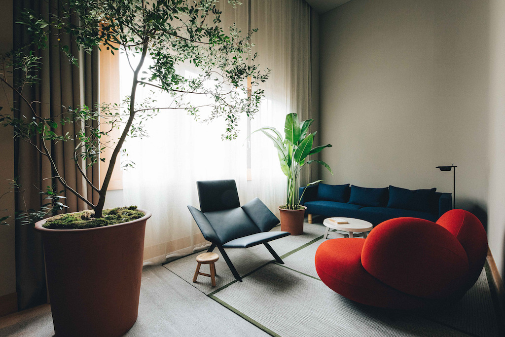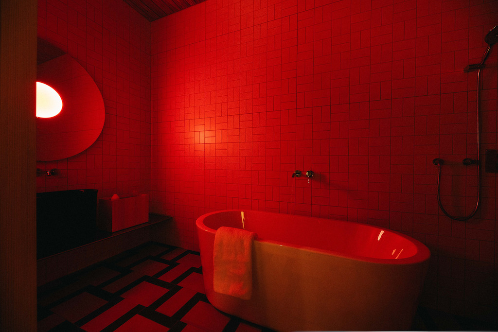 In the guestrooms, bespoke furniture upholstered in Kvadrat textiles highlight the hotel’s oscillation between both Scandinavian and Japanese design sensibilities – spanning seating to pencils. Further, the bathrooms feature custom-made basins with wall-to-wall wood benches, stark white tiling, cedar wood ceilings and both red and white lighting tones. The concept of “aimai” also prevails here by way of unobtrusive Japanese cedar wood partition walls between sleeping areas and bathrooms, and centrally positioned oversized mirrors that impart a marked sense of continuity throughout each space. More refinement is lent by toiletries from Grown Alchemist.