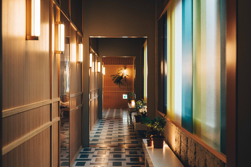 While the presence of traditional accents, such as cedarwood and Japanese stucco, maintain the structure’s authenticity and connectivity to its past, new contemporary elements have been introduced to the space in tandem. For example, original raw concrete flooring is augmented with newer floor coverings honed from the same material. Additionally guided by “aimai’ as a design concept, the spaces exhibit a certain amorphousness, where boundaries are fluid, making the various spaces versatile and adaptable for different functions. This is best exemplified in public areas such as the reception, which also duals as a coffee shop that subtly segues into a wine bar and restaurant, thanks to a purposeful blueprint conceived with the intention for all spaces and functions to intermingle.