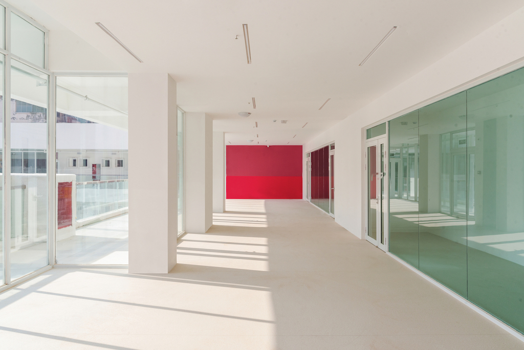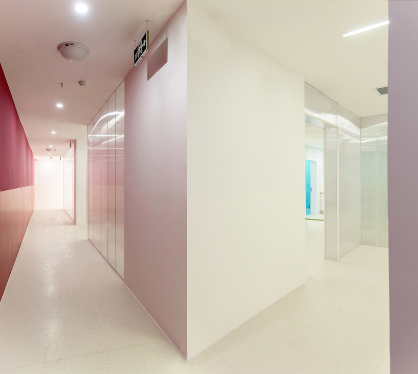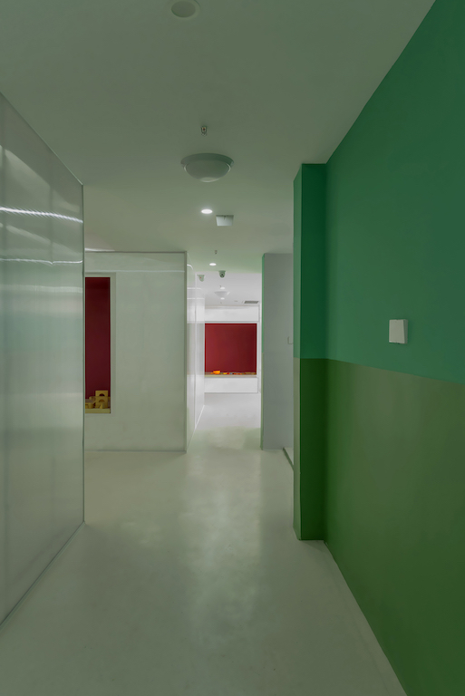 Pitching in from the outside to the inside, walls with high saturation colours were used which established the stereoscopic sense of the deep white space, but also guided the transformation order of the different functions of the space. The architects also eliminated the boundary between the internal building and the external space, with two parts ultimately extended and integrated with each other.