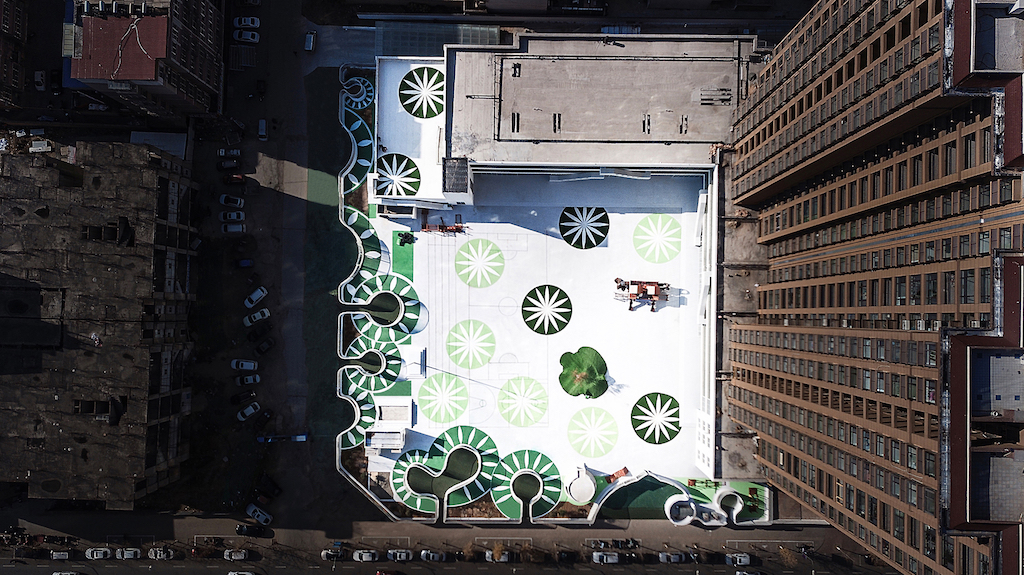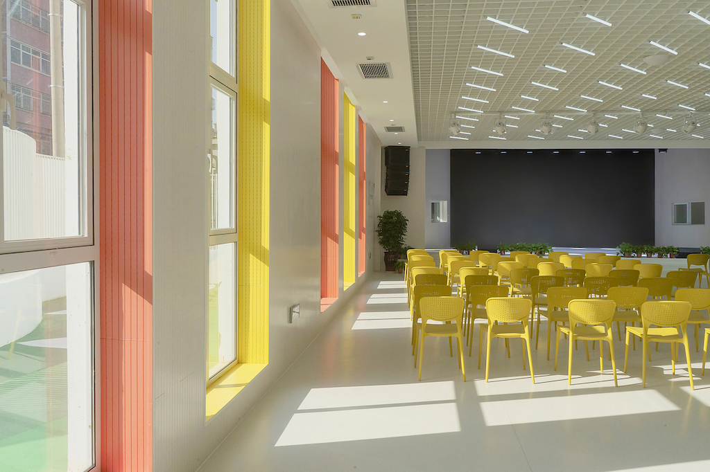 Removing the decorations and all the extra vertical lines on the L-shaped corridor, getting rid of the original shape, Zhang and his team cleaned the external facade of the original building as much as possible to make the building simple and versatile. With five sets of slides leaning out of the facade, the outdoor space of each floor is connected, with undulating activity paths.