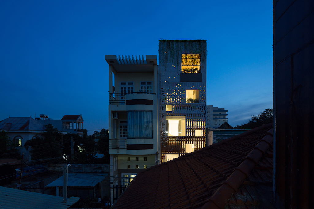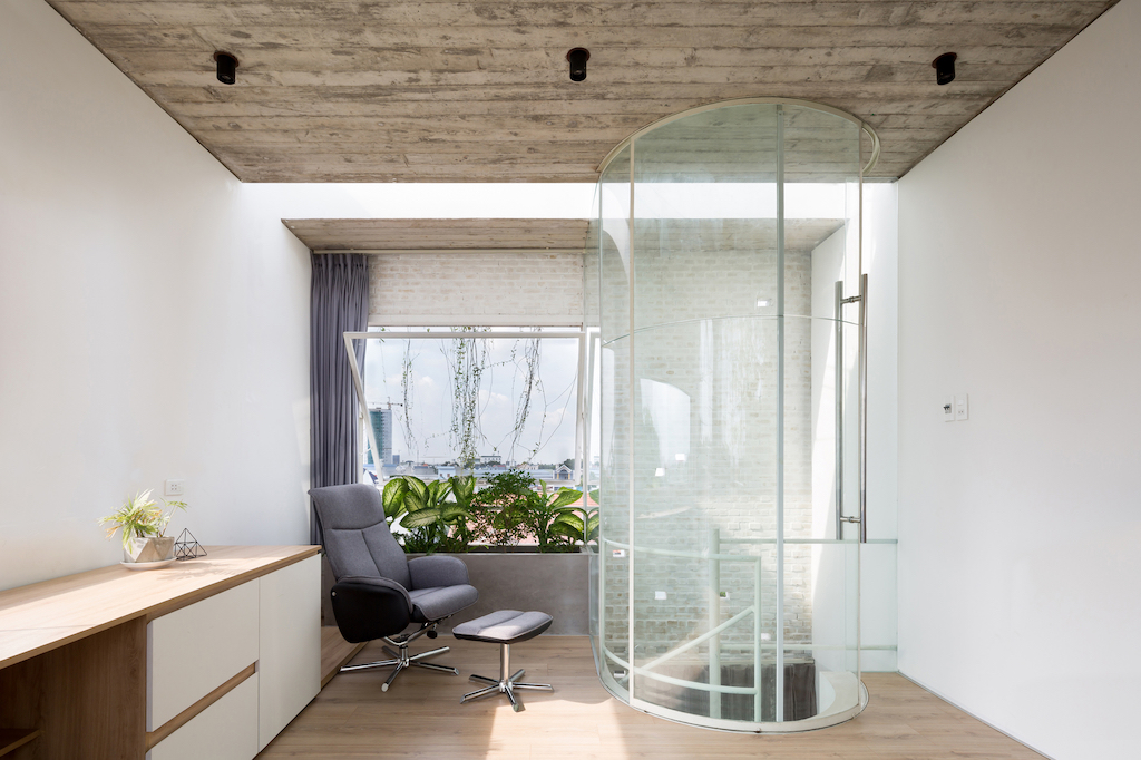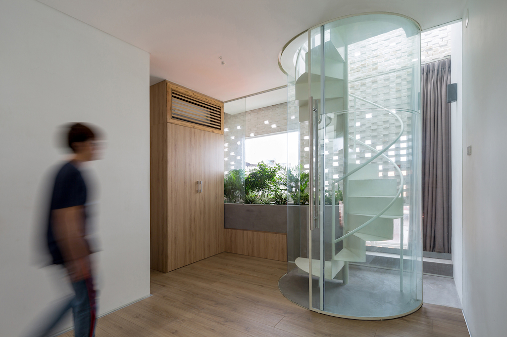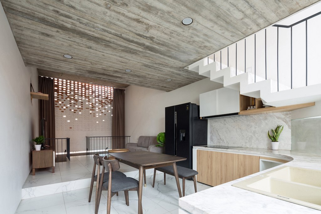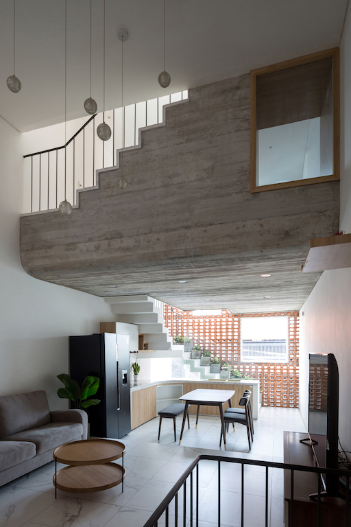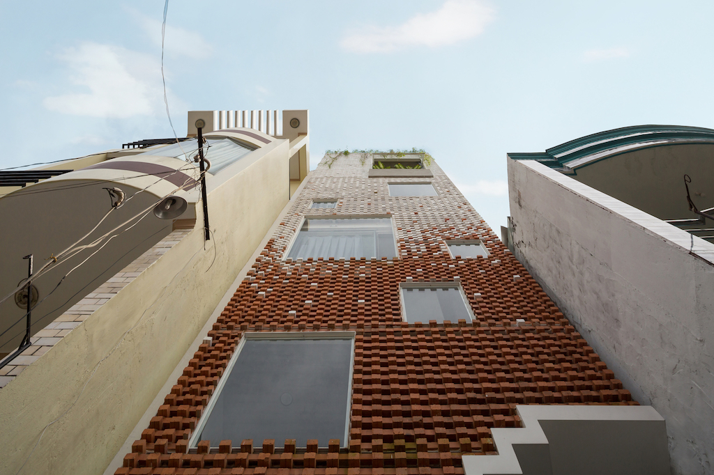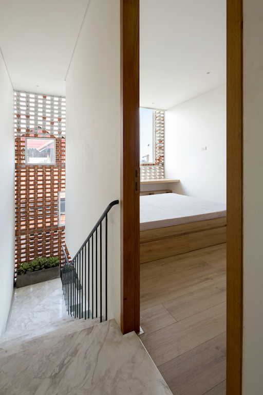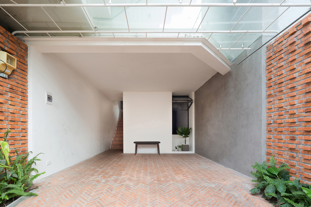 The design team used “The Boundary” as the underscoring theme of the project. The vertical boundary outlined the partition between interior space and the outside one. Instead of the original idea about the façade – completely closed as a straight, solid wall – it was later developed into a semi-space limited by a solid-and-void brick “curtain” wall and inner room’s walls. These room walls work as the second layer of façade, together with greenery and stairs put in between the two, all which have created a transitional buffer zone.