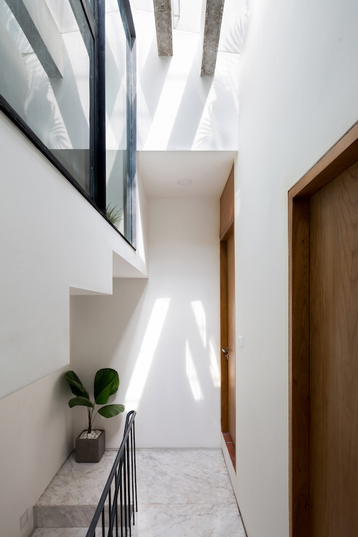 Its transition of colour and porosity describes the privacy level and intention of the spaces arranged behind, graded according to height and function. The interaction gradually diminishes as one ascends the top floors. The architects chose this space for the family’s newly-wed couple’s ensuite bedroom as well as a creative workspace for the husband, who is a graphic artist.