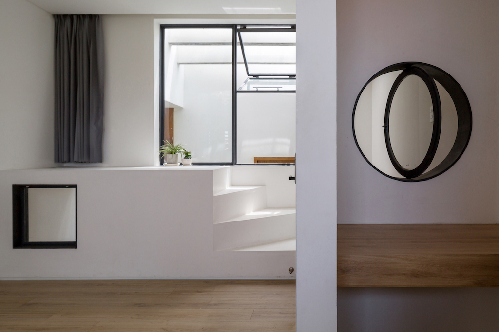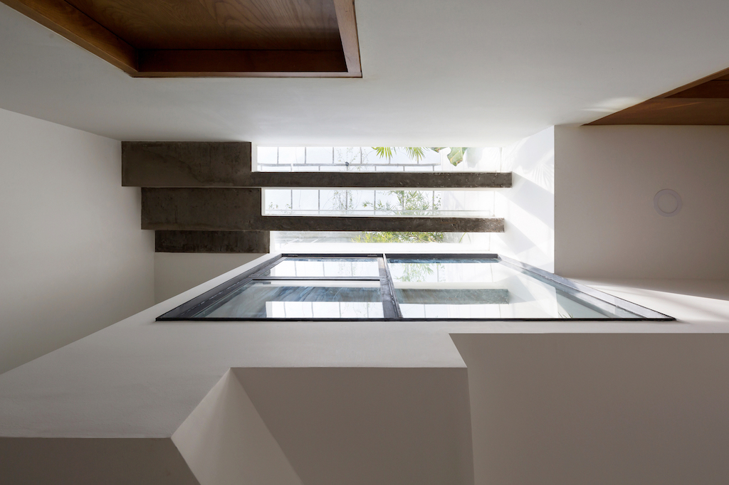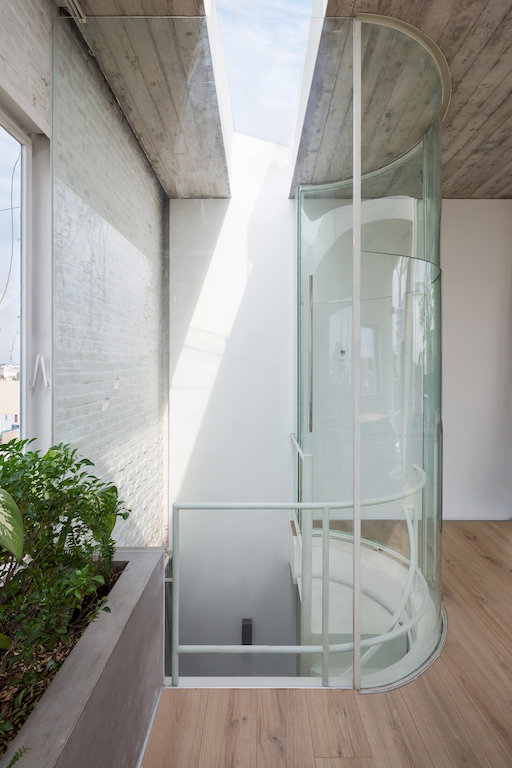 While the vertical boundary is a way of communicating between the building and context, a horizontal strategy has been used in the inner spaces. Through the diversity of height created by different slabs – replacing the continuous ones often found in typical tube houses – there is increased activity among the family members. The open spacious plan, together with flexible stairs system which runs around the house, mitigates the small space by opening up the house spaces – all in the limited construction area of 4×8 meters.