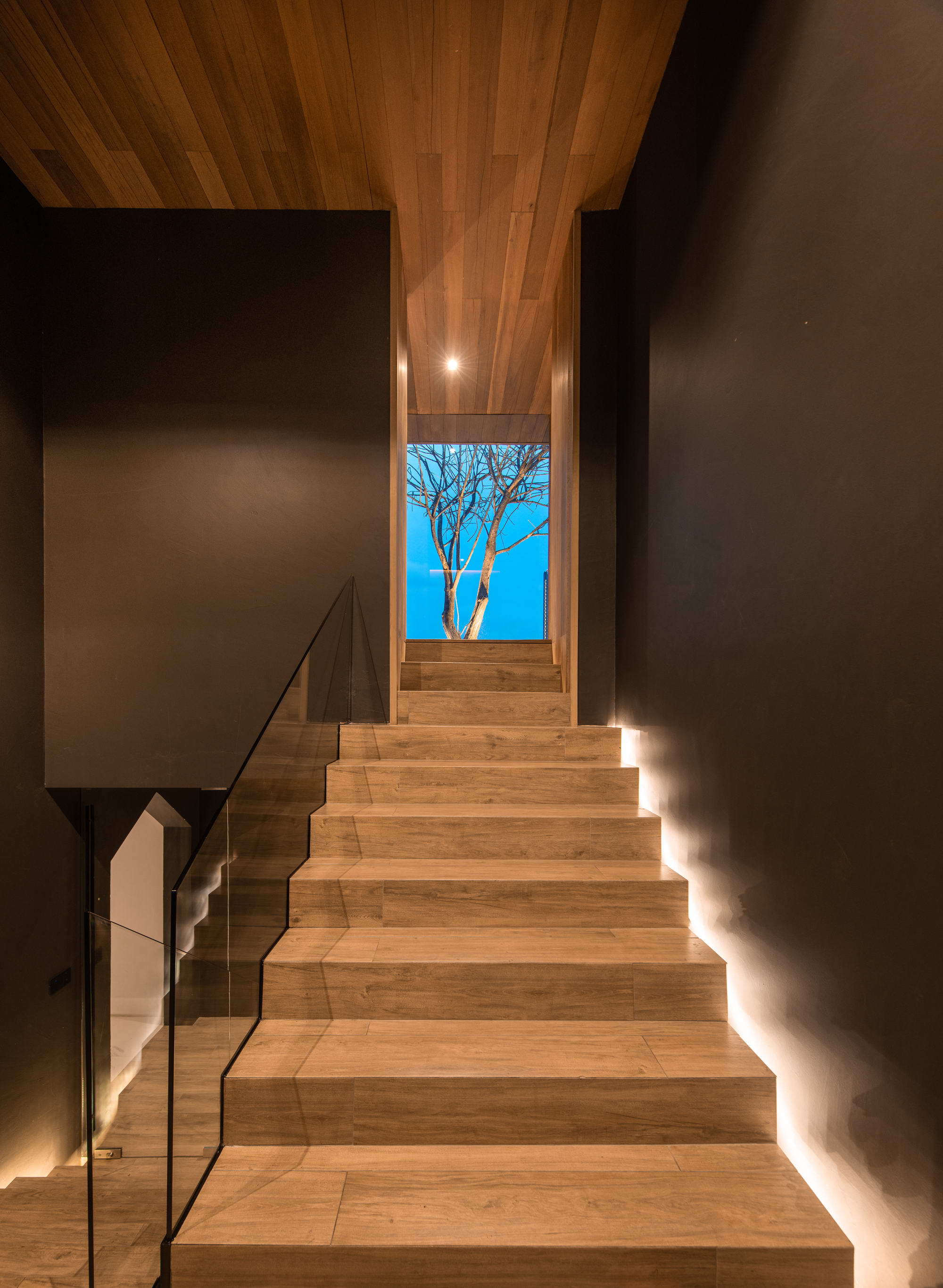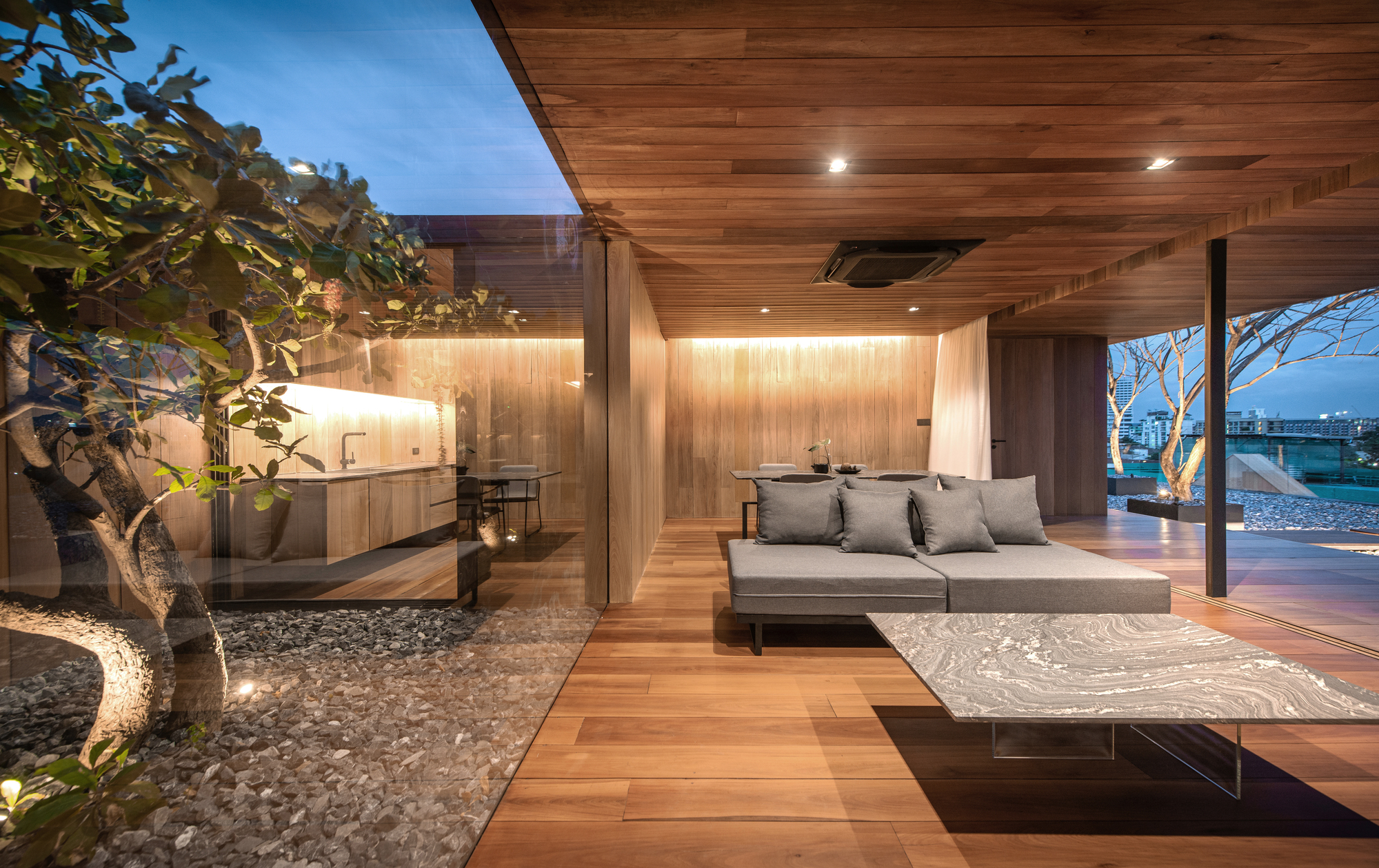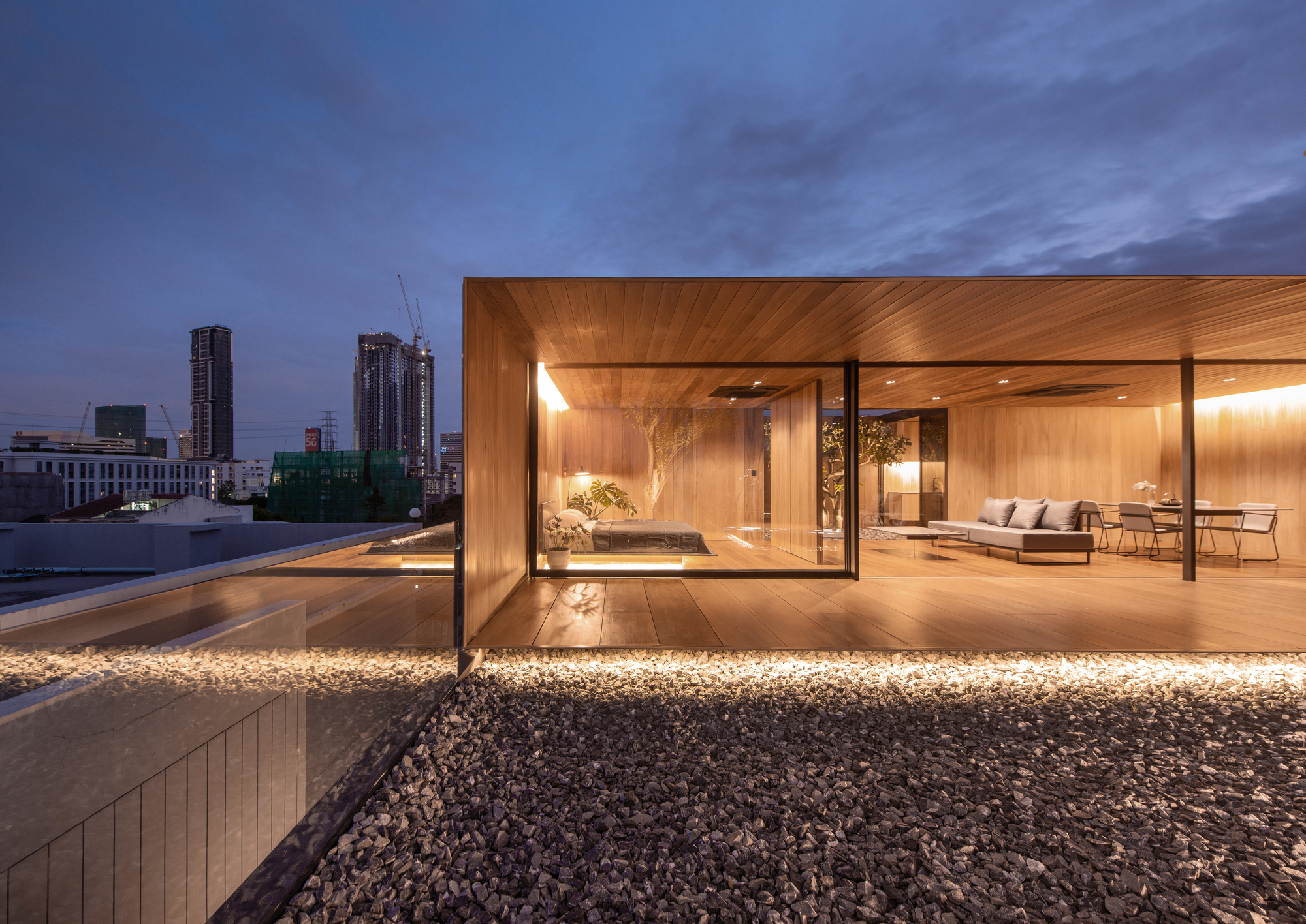“Our idea was not to make this house feel like a building but to free it from form. We wanted it to be just a borderless box that emerges out of nowhere in the sky, as if the thickness of the wall and roof were non-existent, but still able to make holes in the ceiling to install curtains, air conditioners, and embed lights,” says the team comprised of architects Thawin Harnboonseth and Photsawat Apariman from WARchitect. “Our intention was to give an illusion to onlookers that the entire ceiling was in the same straight line even though we featured a drop ceiling and a slope that was intentionally used to make the wall and ceiling look thin. These techniques may not be new in architecture. However, with this rooftop house, it is more special since a short distance between the main structure and the exterior helps disguise the techniques we used.”