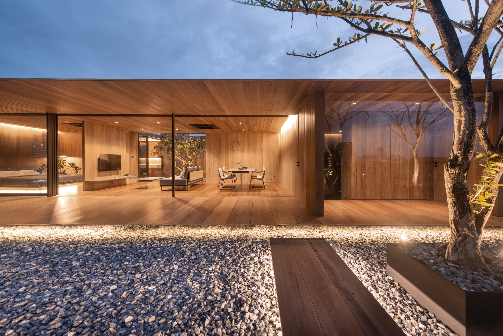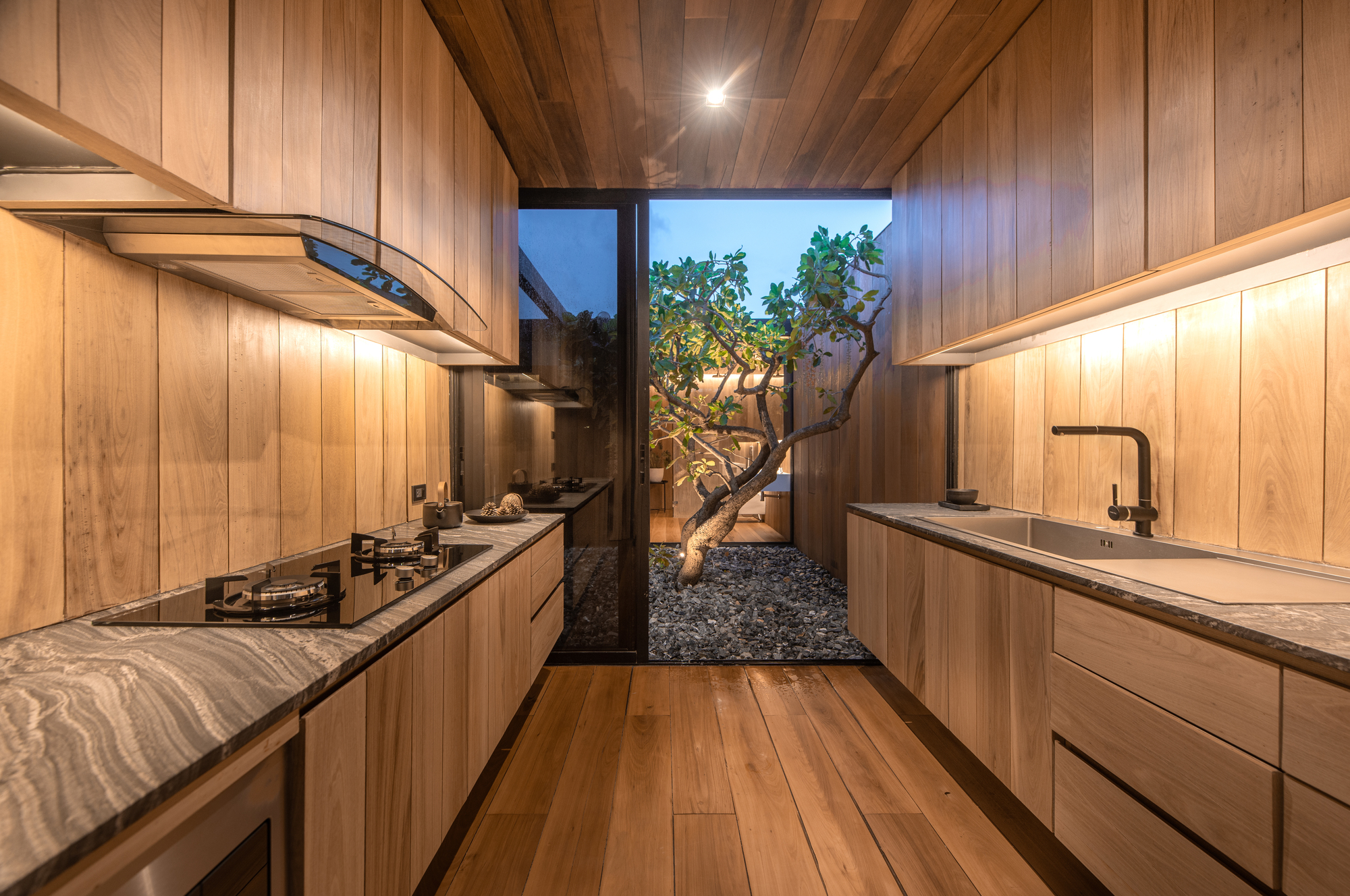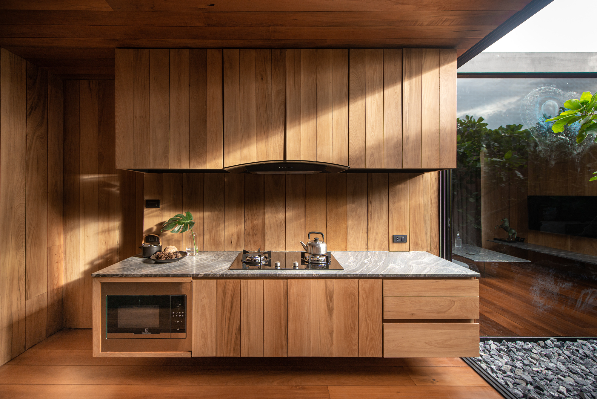 “Since the owner already had a large number of Balau wood planks, we used them as the covering material. Even some planks have defects such as cracks, gnarls, marks from saws, and uneven colors, we see them as a natural charm of real wood, so we did not need to discard any of them. When the construction was finished, the final result is a “space” completed with the warm colour of the wood and the cool tone of the sky, just exactly as we wanted it to be,” explains the team.