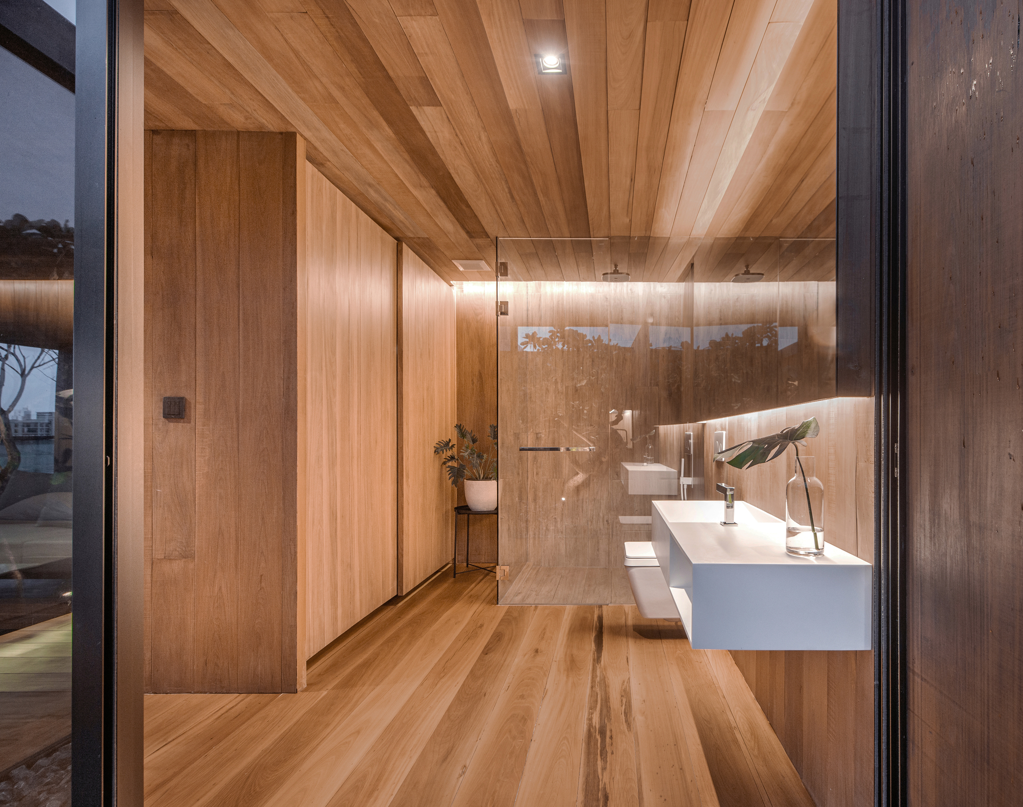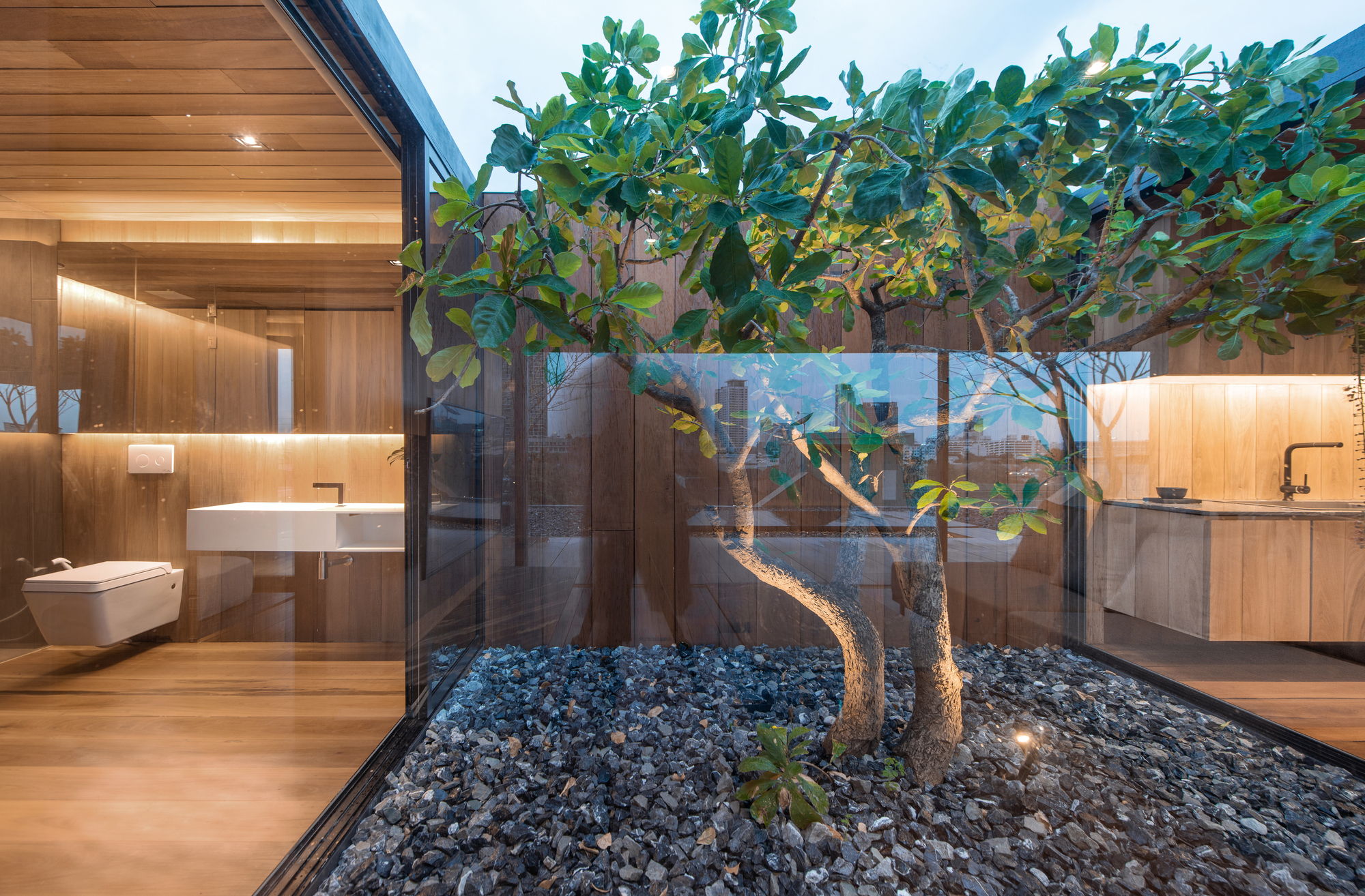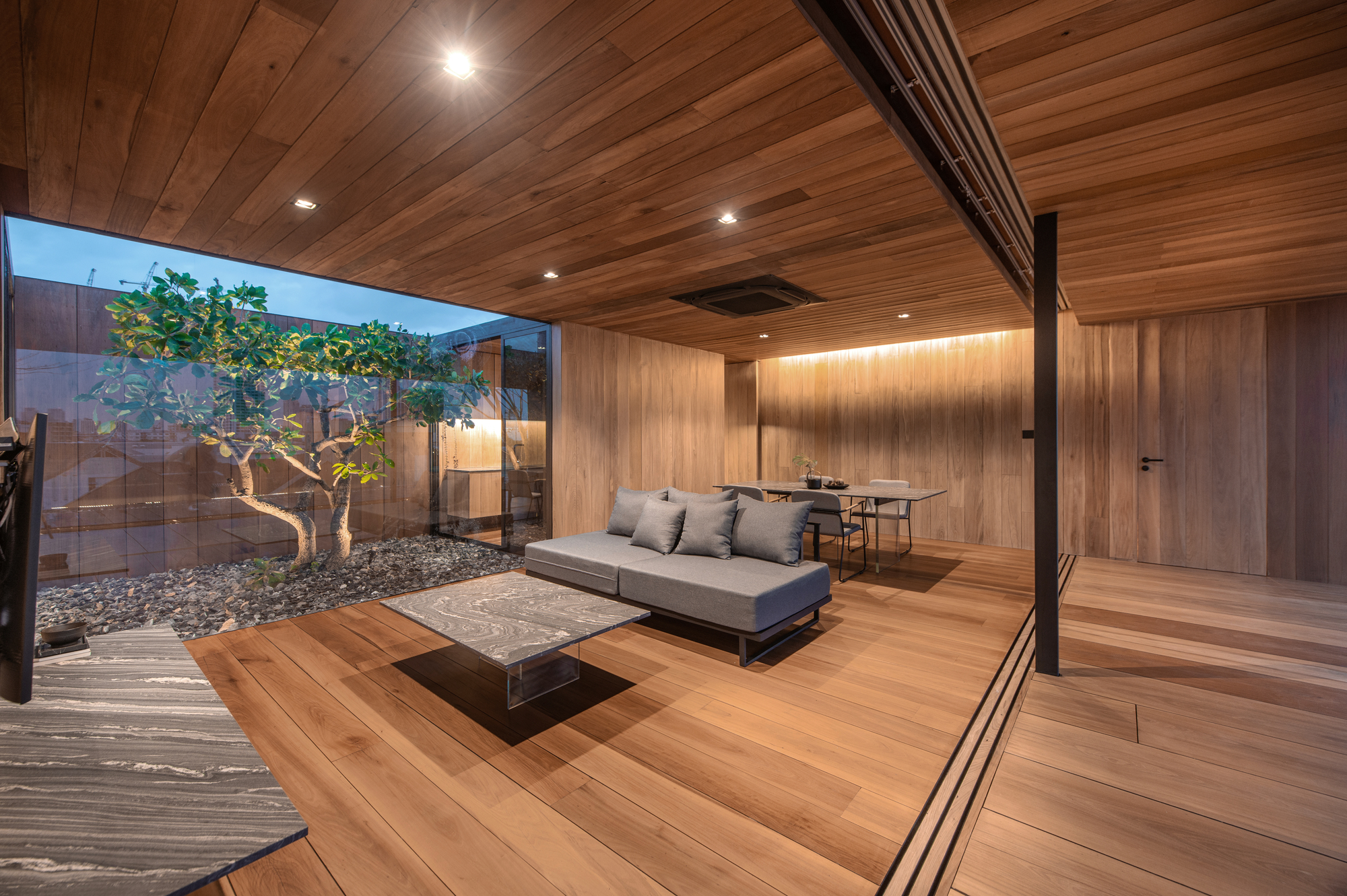 “Since the owner already had a large number of Balau wood planks, we used them as the covering material. Even some planks have defects such as cracks, gnarls, marks from saws, and uneven colors, we see them as a natural charm of real wood, so we did not need to discard any of them. When the construction was finished, the final result is a “space” completed with the warm colour of the wood and the cool tone of the sky, just exactly as we wanted it to be,” explains the team.